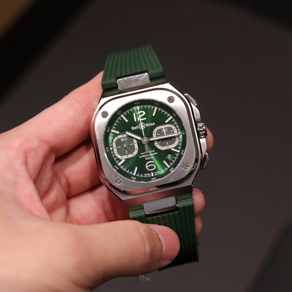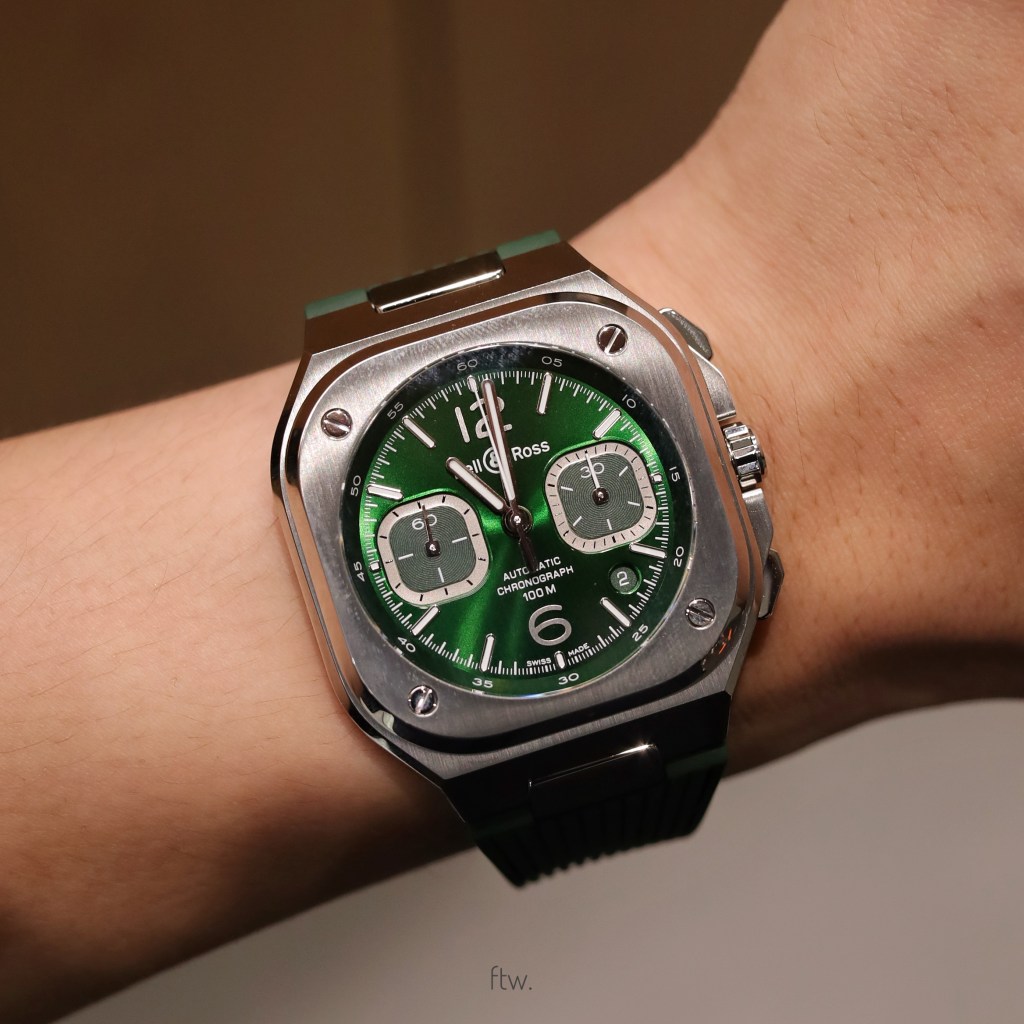 In the world of chronographs, creating a piece that first of all, isn’t called a Daytona lookalike is a challenge of its own. Everyone has their own definition of a good chronograph, and mine is pretty simple. In my eyes, a good chronograph needs to first of all, be well-balanced. And what we have here is in my opinion, a well-executed chronograph from Bell & Ross, the BR05 Chrono in green.